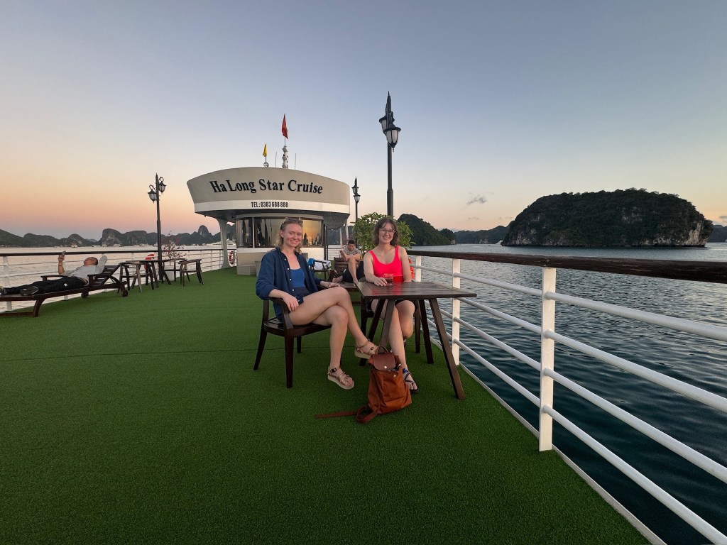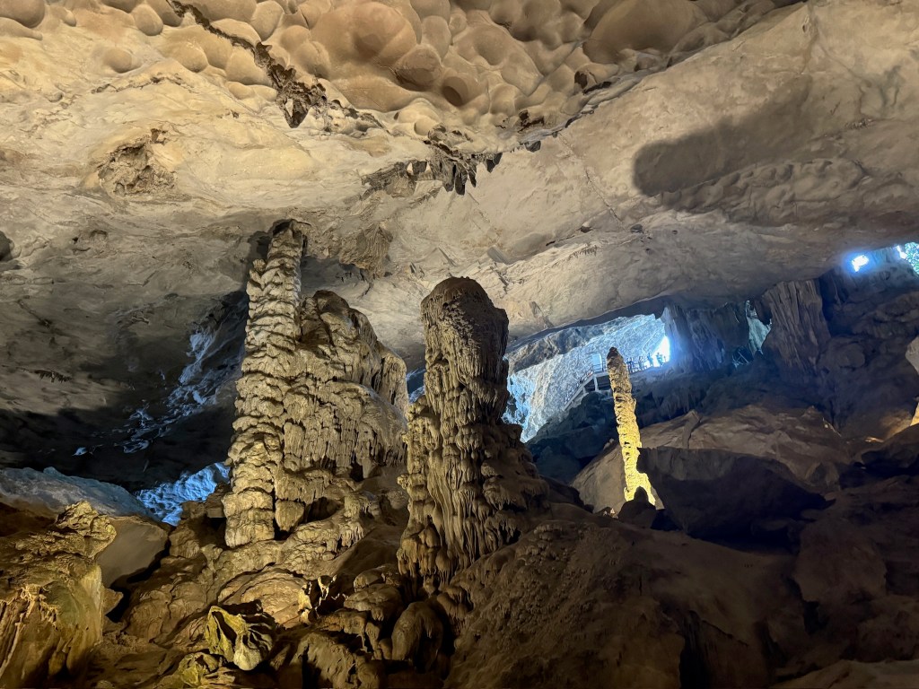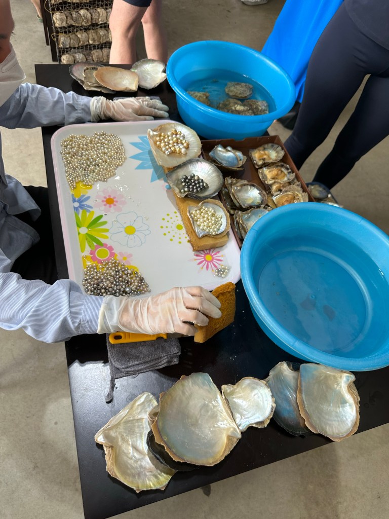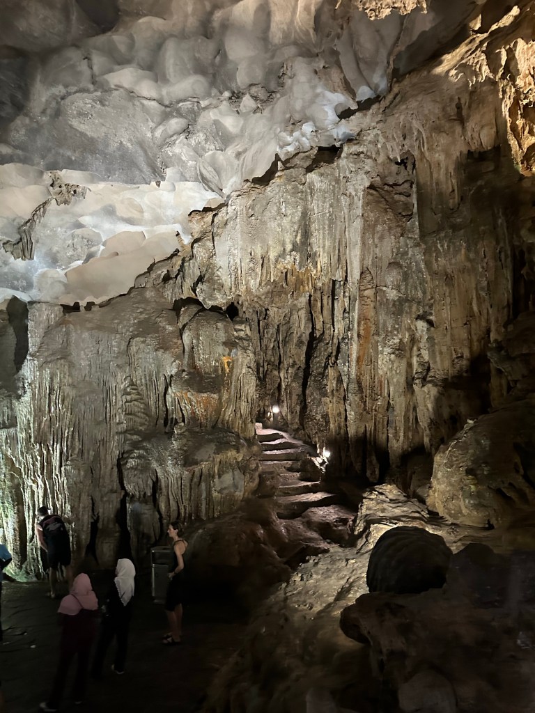 Today we took a guided day trip tour to Ha Long Bay. It was about a 2 hour drive with scenic views. First stop was at an oyster pearl farm. They walked us through how they create the pearls and harvest them. They put a small plastic ball inside the live oyster, and then put them back in the ocean for 2-5 years. The ball supports the sharpe of the pearl and the oyster creates a film around the ball to create the shiny outer layer of the pearl. Only 5% of the pearls turn out perfect, but the rest are used for earrings or turned into dust for moisturizer.