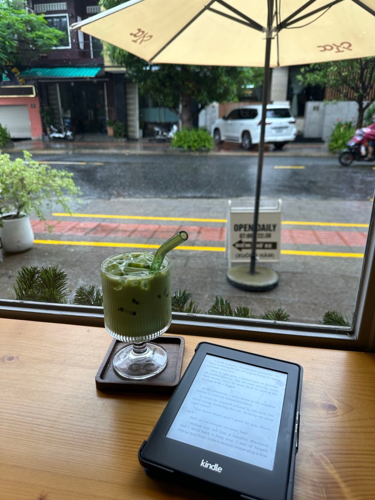 Too it easy this morning before my flight out of Da Nang. Read my book with a matcha while it rained!