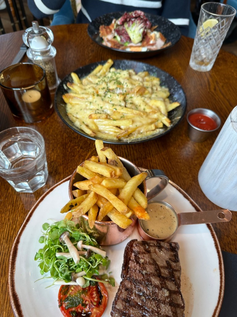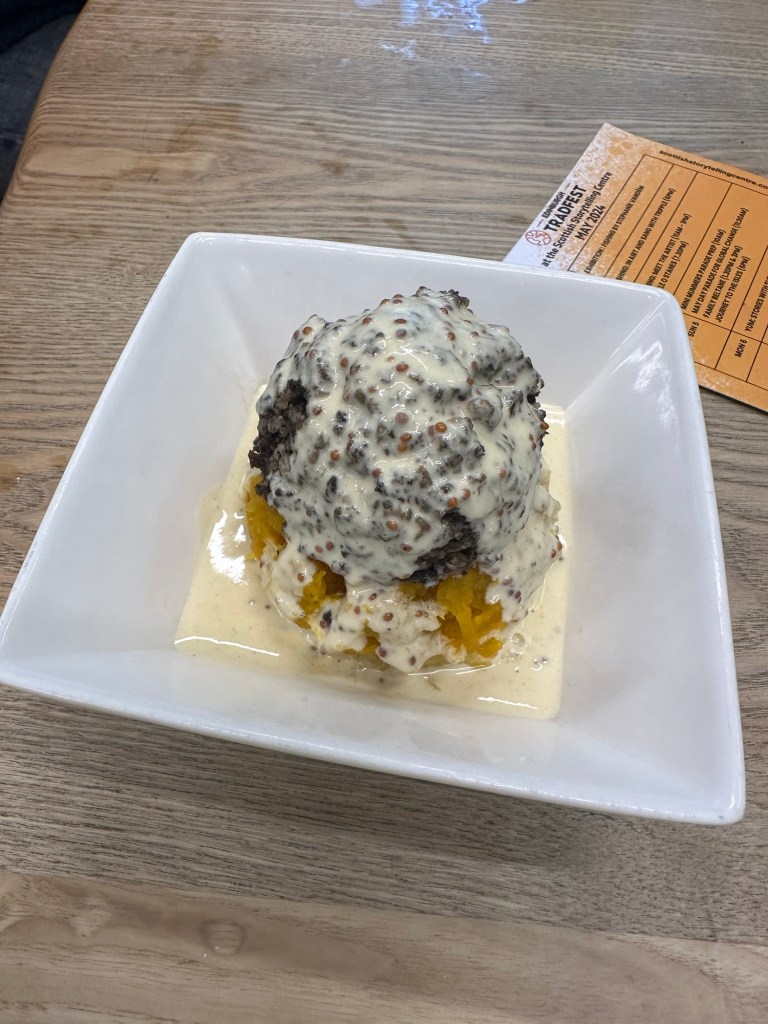 After the tour, we were ready to eat! Haggis is the national dish of Scotland. It’s composed of ground sheep liver, heart, lung and oatmeal, cooked in sheep’s stomach lining. While yes, that sounds disgusting, it was actually pretty good! Served with neeps (mashed turnips) and tatties (mashed potatoes) . This one served with a whiskey mustard sauce.