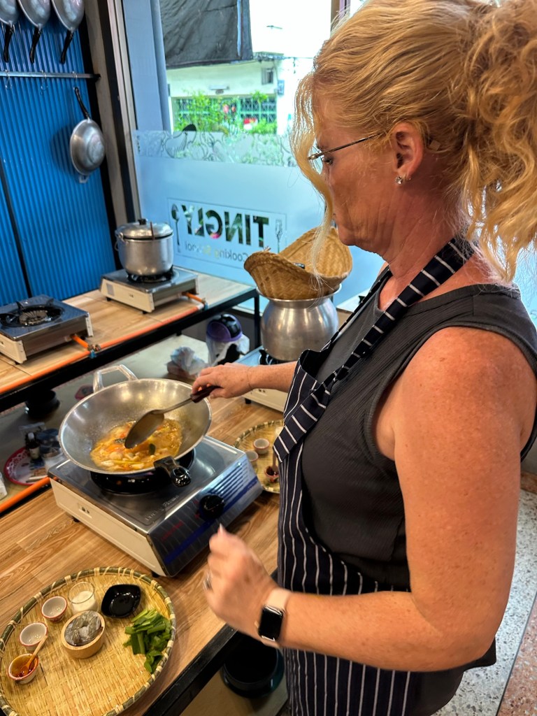 We learned the larger the chili the less spicy it is. Green is more spicy than red chili. And the more you chop the chili the spicier it is. I gotta say, for this white girl from Nebraska, I’m doing pretty good with the spice! Actually impressing myself LOL