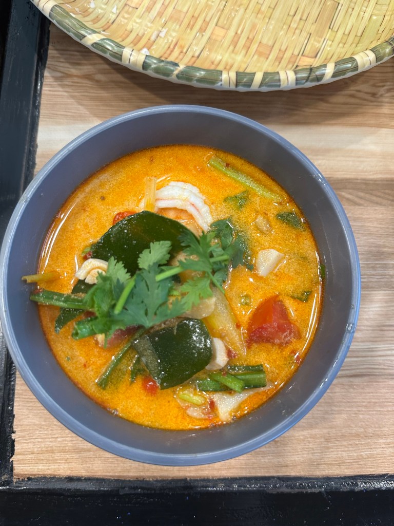 First dish is Tom Tum Goong – hot and sour prawn soup! So delicious and a good amount of spicy! This recipe required coconut milk and we actually got to make it ourselves form freshly ground coconut we got at the market.