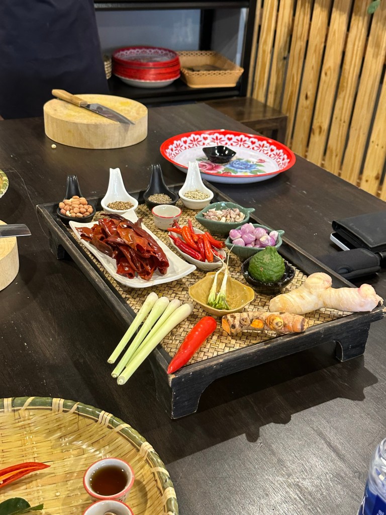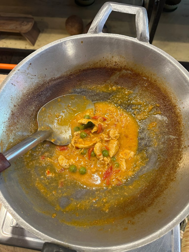 Recipe #3 is Panaeng gai – chicken curry. This one required us to make our own curry paste from all those fresh produce in the photo above. That’s the video below! 😂