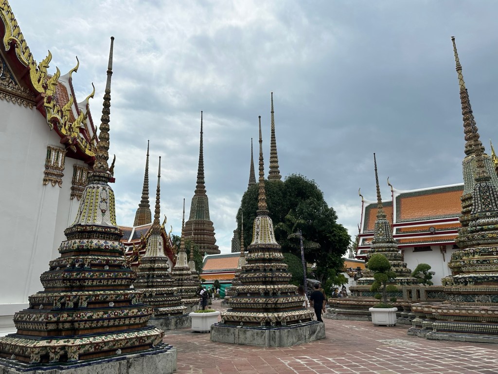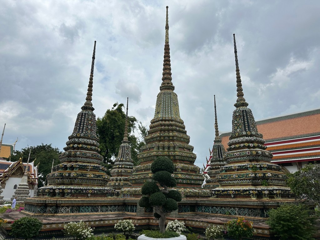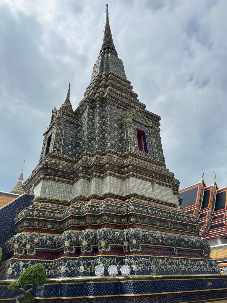 Next part of the day required us to hop on a tuk tuk to see the reclining Buddha. The complex is called Wat Pho. It’s full of these called ‘Stupa’. They are covered in tiny terracotta pieces that make up intricate patterns.