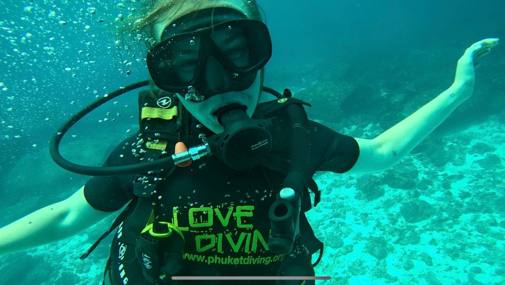Scuba diving is something I’ve been very off and on about. I can swim but I’m not the best swimmer, and open water can be scary sometimes. before the trip started I said I wanted to try it. Then about halfway through I changed my mind. Then when we got to Phuket, I decided why not?! You grow as a person by challenging yourself and being uncomfortable. So I did it. I’m really proud of myself for doing it. I ended up doing 3 dives. First was 30 min, the second was 40 min, and the third was 25 min. The deepest we got was 10.6 meters.