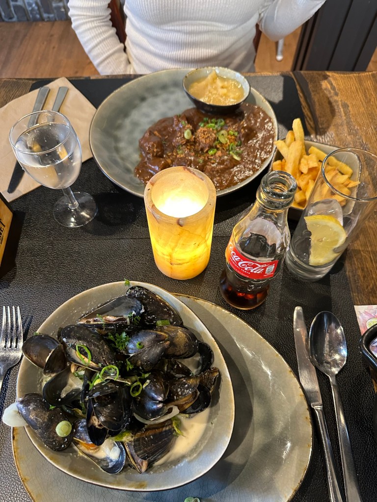 I overheard a Belgian on the train telling some travelers that they had to try Fleming Stew and mussels in Bruges… so thank you , that’s exactly what we did!! And it was so yummy!