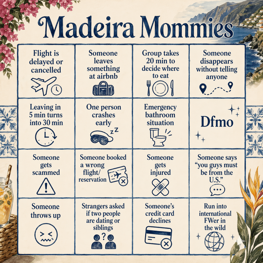 Leg two begins!! Group chat is called “Madeira Mommies” and we present to you our bingo card for the trip!